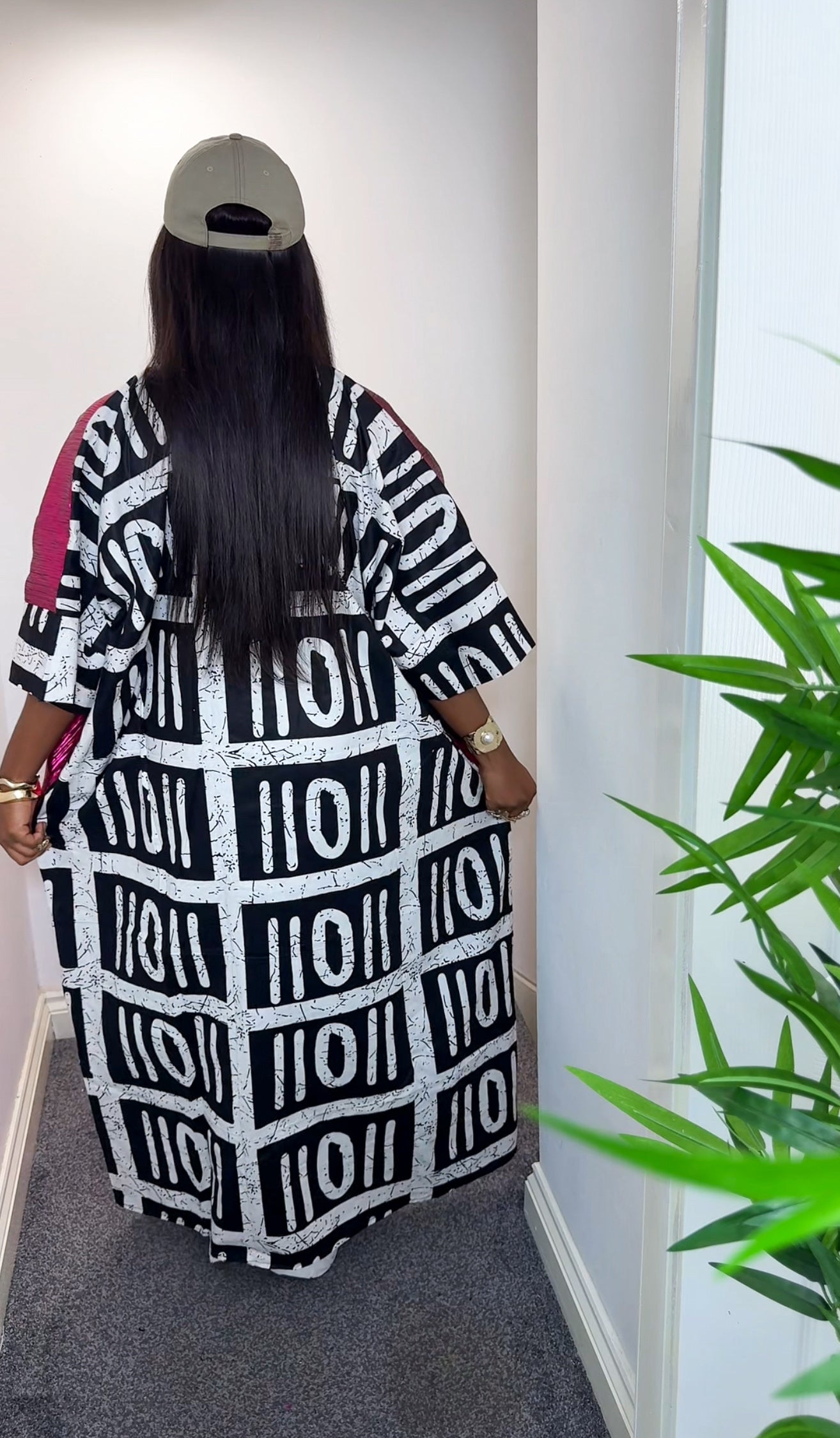 The kaftan's loose, flowing maxi silhouette is both comfortable and effortlessly chic. Paired with a baseball cap and trainers, this piece demonstrates a contemporary, high-street sensibility. It's a statement item that perfectly balances traditional textile artistry with modern street style.