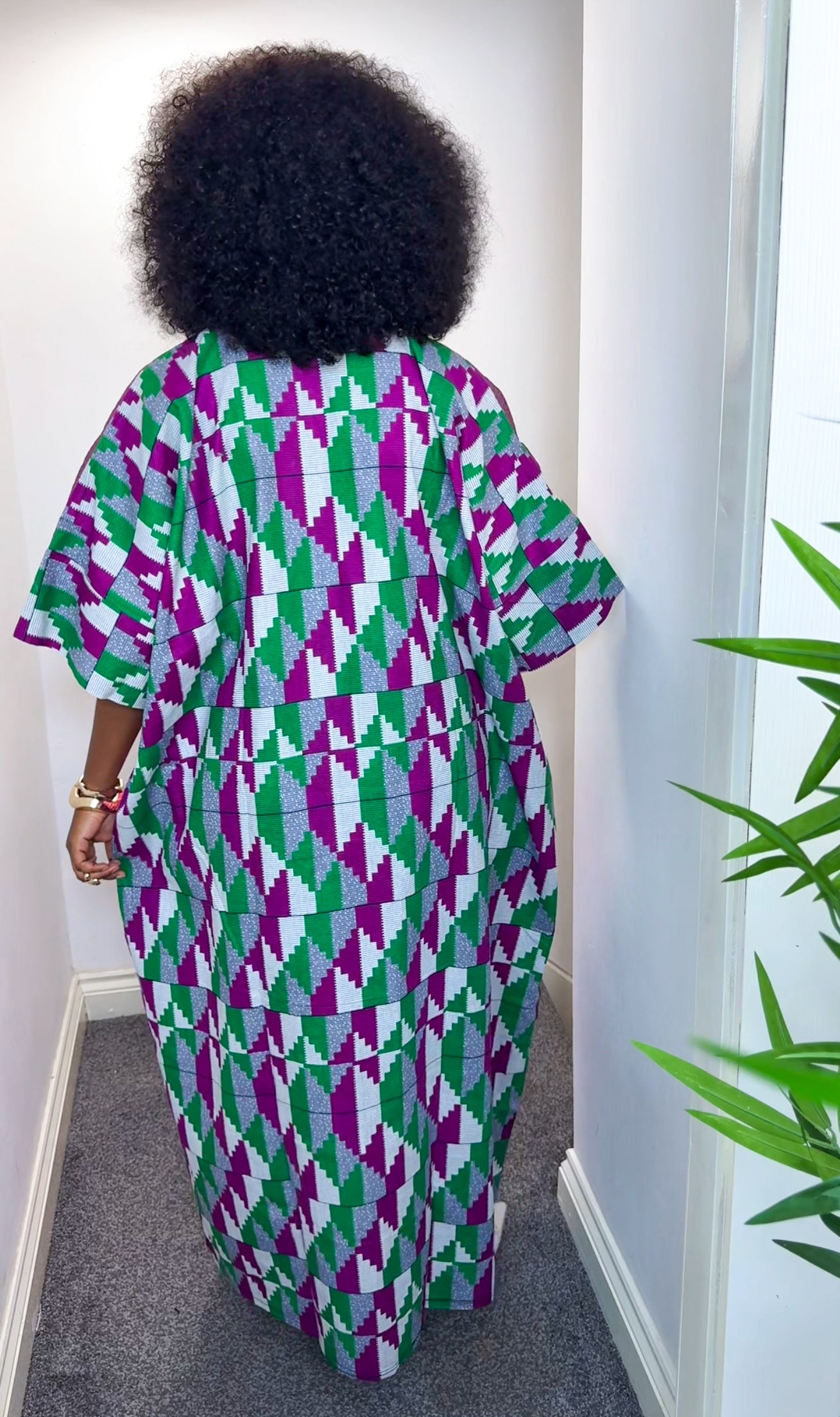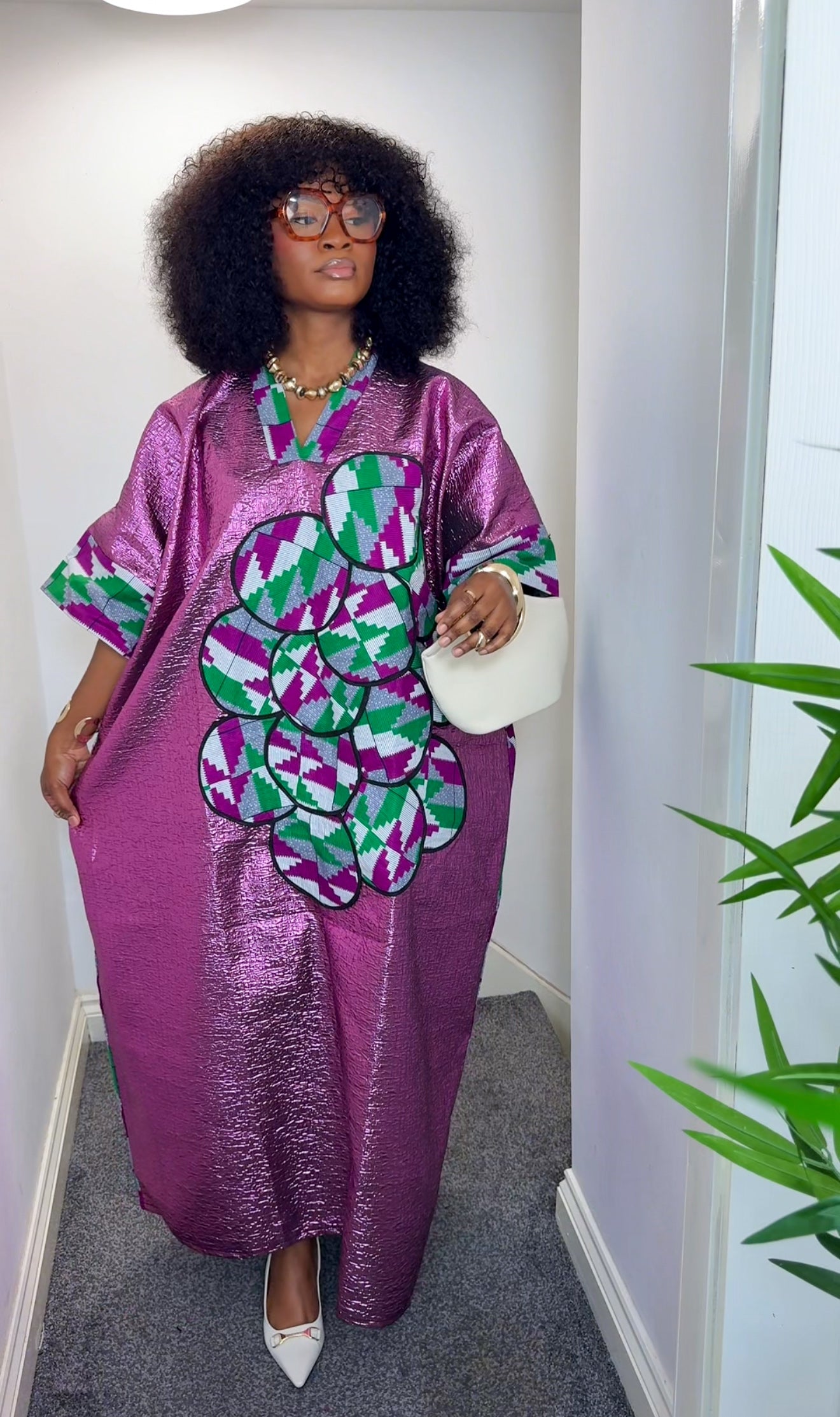 The kaftan's loose, flowing maxi silhouette is both comfortable and effortlessly chic. Paired with a baseball cap and trainers, this piece demonstrates a contemporary, high-street sensibility. It's a statement item that perfectly balances traditional textile artistry with modern street style.
